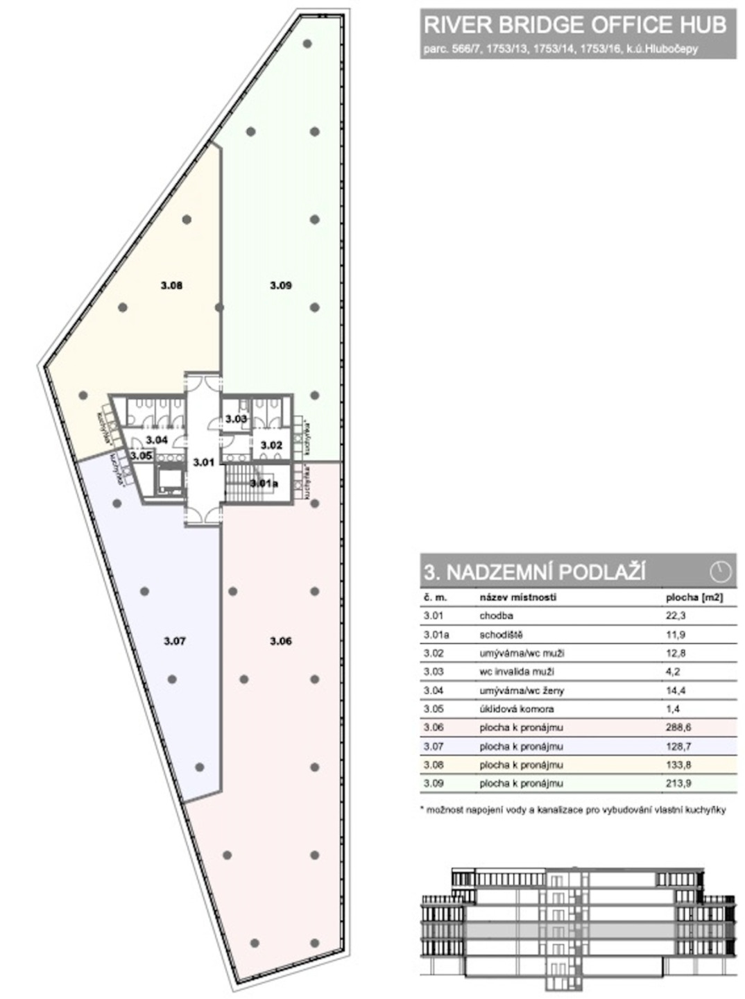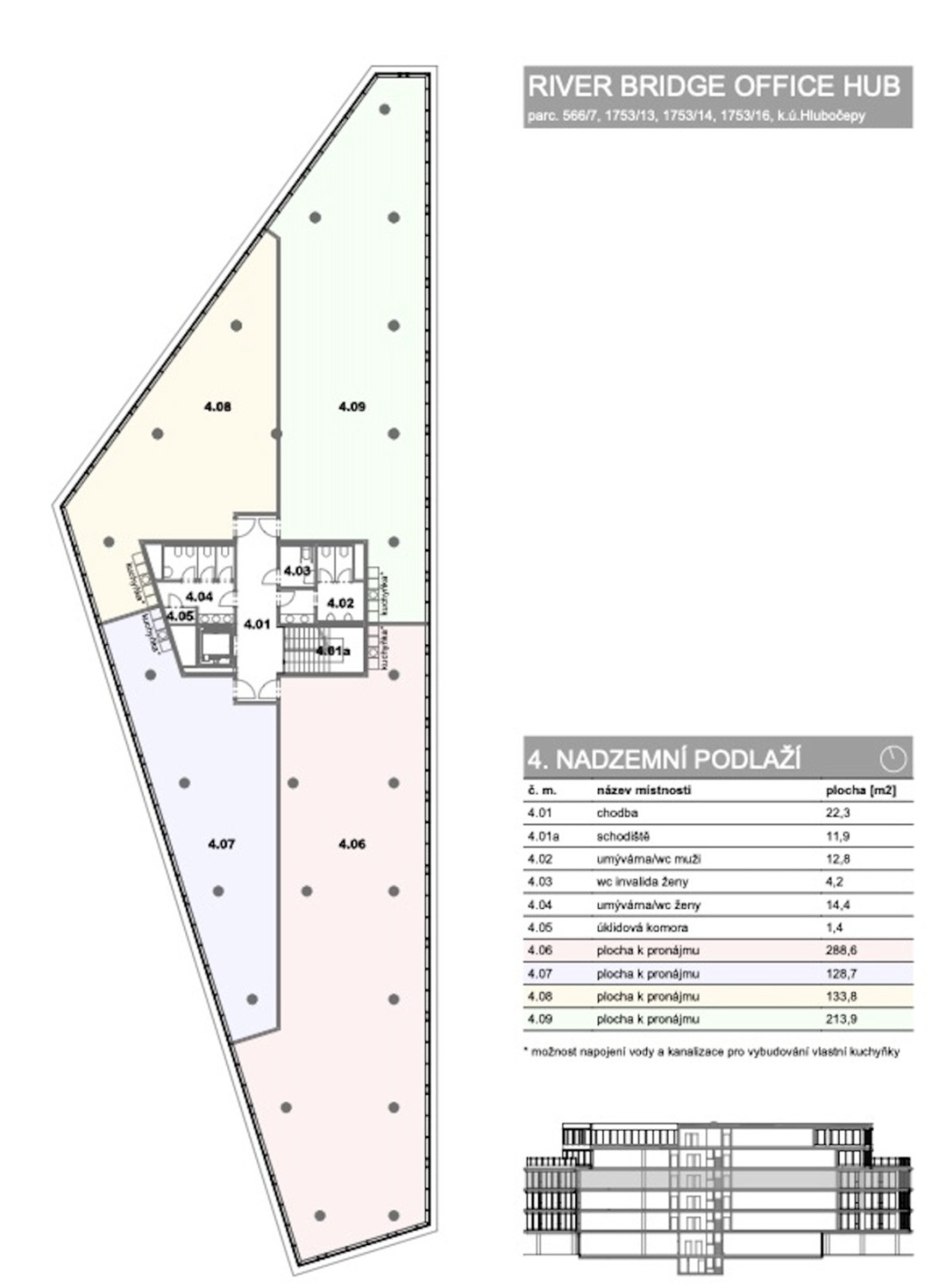 Klienti mají možnost výběru nových kancelářských prostor ještě ve fázi výstavby k nastěhování od 1. 3. 2026. V přízemí budovy se budou nacházet dvě retailové jednotky a v 5.NP bude velká obvodová terasa. Aktuálně nabízíme výběr prostor od 1.NP do 4.NP.